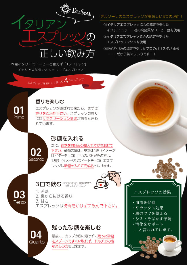 デルソーレでは、この日をきっかけに、より多くの方にエスプレッソの魅力を楽しんでいただきたいという想いから、ランチセットご注文のお客様にエスプレッソを特別価格にてご提供いたします。